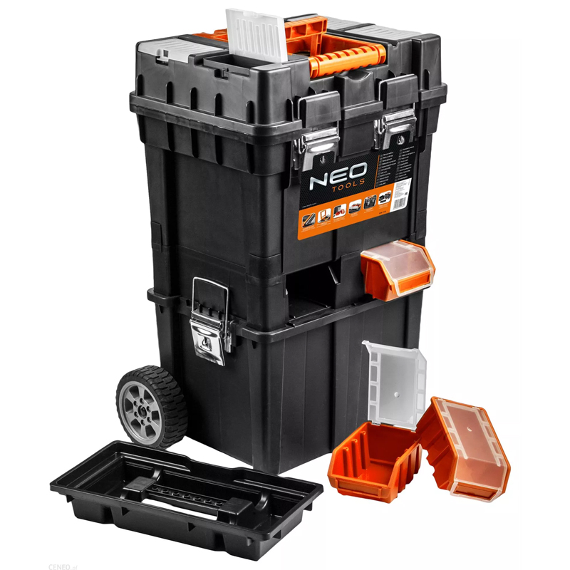 Mobile Workshop, Tool Box, Four Organizers, Four Locked Ergoboxes, Metal Clamps, Positioning Key With Scale, Two Plastic Handles, Side Handles, Two Wheels, Anti Slip Corners