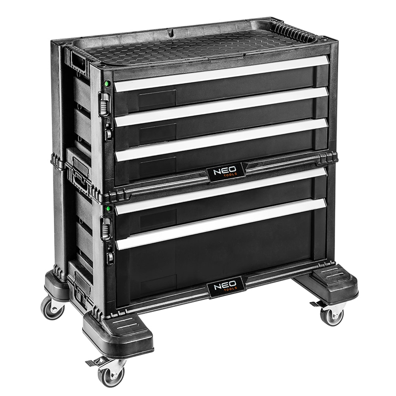 Neo Tool Cabinet, 5 Drawers (Ref. No 84-226), Side Handles, Side Snaps, 24 Containers, Brake, Drawer Lock, Place For Padlock, Wheels, Inside Walls