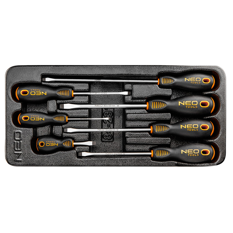 Neo Slotted Screwdrivers, S2 Steel, Three Lobe Handle, Strengthened And Magnetic Tip, Oil Proof Handle Coated With Tpr Rubber, Thumb Rest, Tuv, Sizes: 3.0X75mm, 5.5X100mm, 5.5X200mm, 6.5X38mm, 6.5X125mm, 6.5X150mm, 8X150mm, Profiled Tray