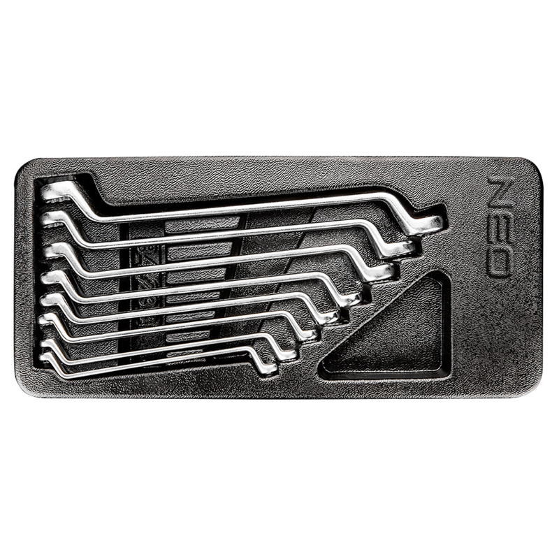 Neo Set of offset Ring Spanners, Din 838, Crv Steel, Sizes: 6X7mm, 8X9mm, 10X11mm, 12X13mm, 14X15mm, 16X17mm, 18X19mm, 20X22mm, Profiled Tray