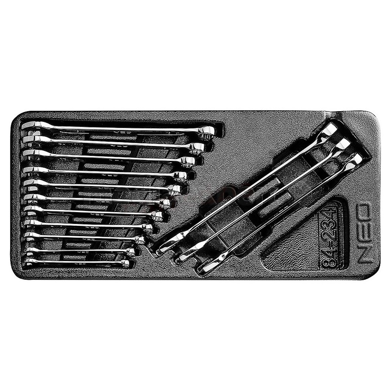 Neo Set of Combination Spanners, Din 3113, Crv Steel, Sizes: 6, 7, 8, 9, 10, 11, 12, 13, 14, 15, 16, 17, 18, 19 mm, Profiled Tray