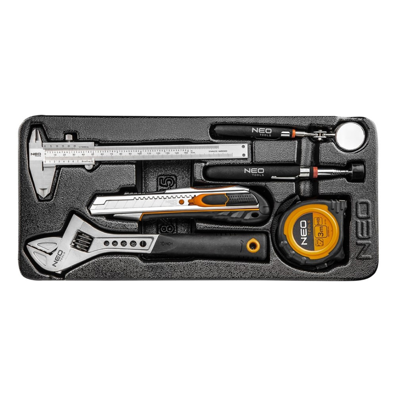 Neo Tools, 6 Pcs Set: Caliper 150mm, Stainless Steel, Snap off Blade Knife, 18 mm, Quick Blade, Two Component Abs & Tpr Grip, Steel Guides, Adjustable Wrench Din 3117, Crv Steel, Tuv, Pocket Tape Ruler 3M, Nylon, Mid, Holder 3Kg, Telescopic 160-610mm, Mirror, Telescopic 170-470mm