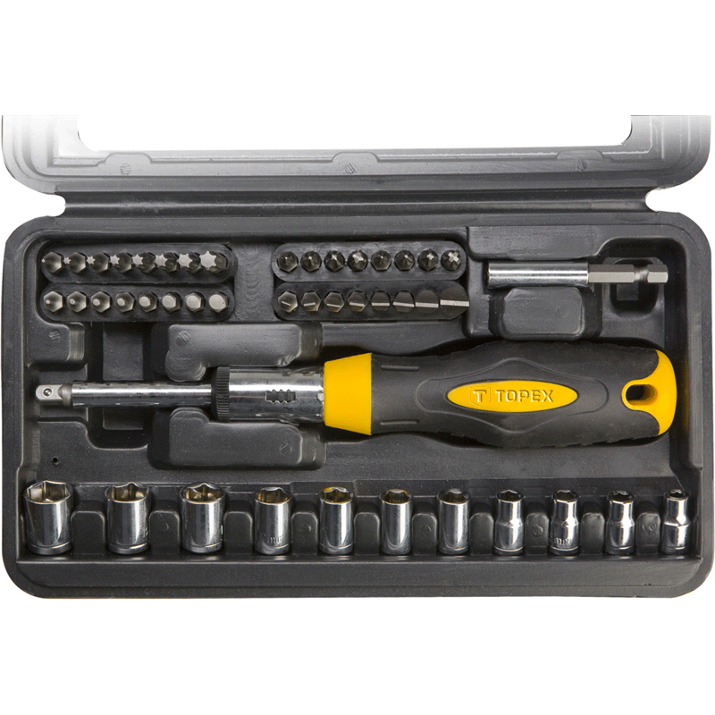 Driver Bits With Holder, Two Material Handle With Ratchet With Left/Right Lock, Bits: Slotted 3, 4, 4.5, 5, 6, 7, 8, 9 mm, Ph0, Ph1, Ph2, Ph3, Pz0, Pz1, Pz2, Pz3, Star: 15, 20, 35, H1.5, H2, H2.5, H3, H4, H5, H5.5, H6, T5 T10, T15, T20, T25, T27, T30, T40, Square Adapter 1/4 In; Hexagonal, Hexagonal Sockets: 4, 5, 5.5, 6, 7, 8, 9, 10, 11, 12, 13 mm, Plastic Case